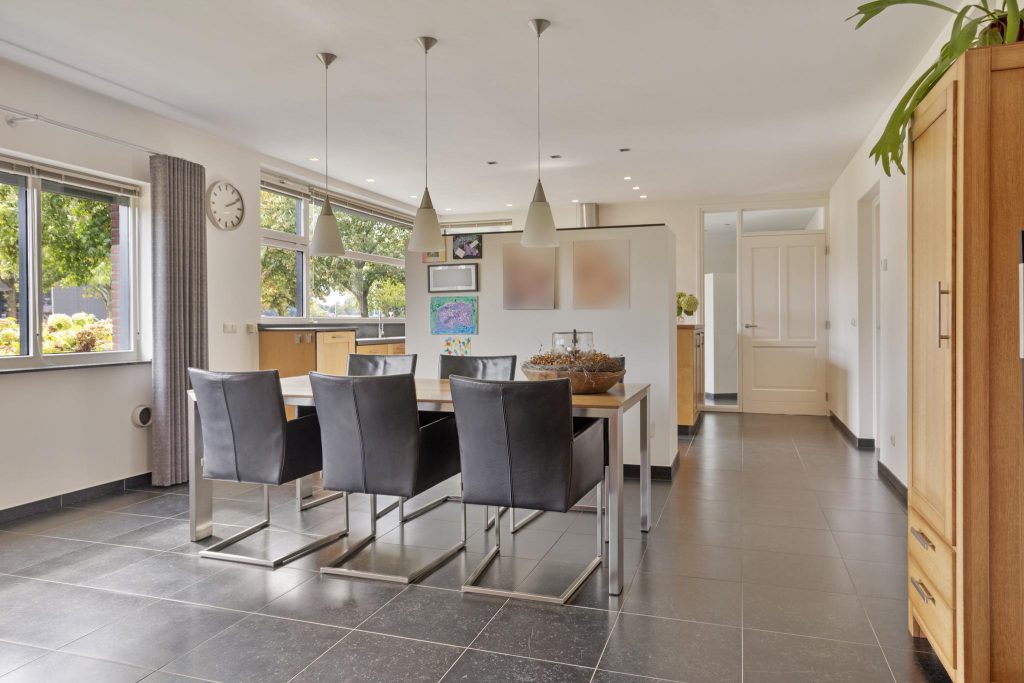 Aansluitend aan de keuken bevindt zich de woonkamer, welke eveneens geheel voorzien is van vloerverwarming. De woonkamer is afgewerkt met een tijdloze tegelvloer welke dorpelloos in verbinding staat met de rest van de woning. Middels de grote schuifpui aan de achterzijde ontstaat een uniek tuincontact met tevens veel luchtinval.