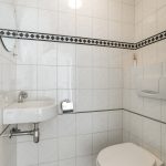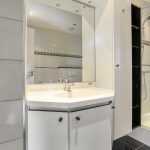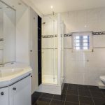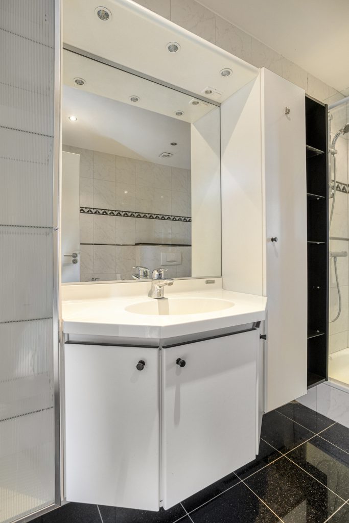 De badkamer is ruim van opzet en uitgevoerd met een tegelvloer en volledig betegelde wanden. De ruimte wordt verwarmd middels vloerverwarming en is ingericht met een inloopdouche, ligbad, vaste wastafel en een zwevend toilet.