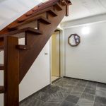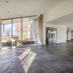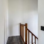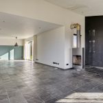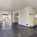 Via de voordeur aan de voorzijde van de woning betreedt u een imposante hal, waar tevens het trappenhuis is gesitueerd dat toegang biedt tot zowel de bovenverdieping als de kelder en de inpandige garage. In deze hal bevindt zich daarnaast een separaat toilet en de meterkast. Via dubbele glazen deuren bereikt u de naastgelegen woonkamer. De hal is afgewerkt met een leistenen tegelvloer en strak gestucte wanden, wat direct een verzorgde en uitnodigende indruk geeft.