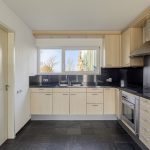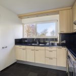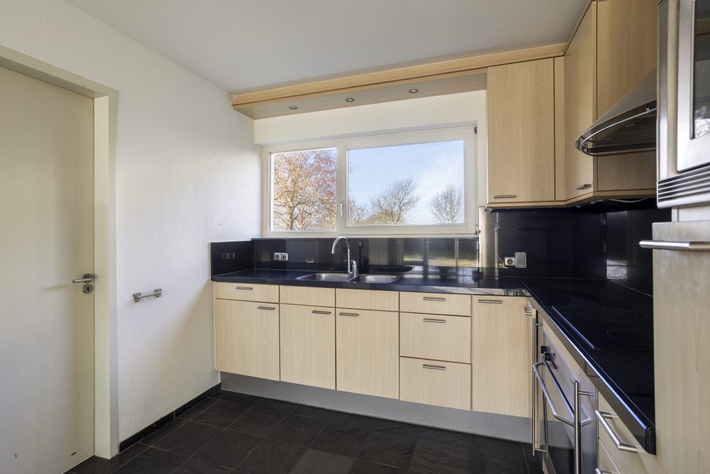 De open woonkeuken is opgesteld in een praktische L-vorm en beschikt aan de linkerzijde over een losse kastenopstelling. De keuken is uitgevoerd in hout en voorzien van een hardstenen werkblad, wat zorgt voor een warme en robuuste uitstraling. De keuken is uitgerust met de benodigde inbouwapparatuur, waaronder een ingebouwde koelkast, oven, inductiekookplaat met afzuigkap en een dubbele spoelbak. De raampartij boven de spoelbak zorgt voor veel natuurlijk licht en een prettig uitzicht over het eigen terrein en de wijngaard. De leistenen vloer en strak gestucte wanden van de woonkamer lopen door in de keuken, waardoor er een rustig geheel ontstaat. Via de keuken is tevens een (was)ruimte bereikbaar, waar de benodigde witgoedaansluitingen aanwezig zijn. De vloer bestaat uit dezelfde leistenen vloer en wanden die voor driekwart betegeld zijn.