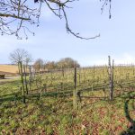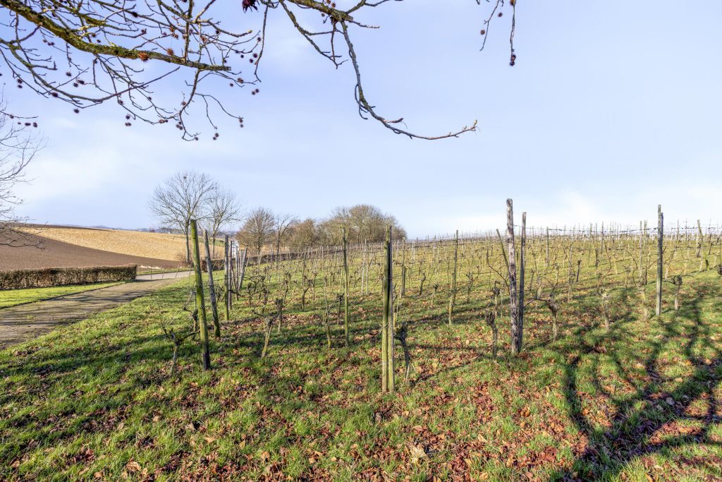 De wijngaard van ca. 0,5 ha ligt fraai op het glooiende perceel en sluit mooi aan bij het open heuvellandschap rondom de locatie. De aanplant bestaat uit drie sterke en veelgebruikte rassen, namelijk de Johanniter en Solaris (wit) en Cabernet Cortis (rood). De rijen zijn overzichtelijk aangelegd en profiteren van