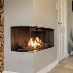 De woonkamer is stijlvol ingericht en voorzien van een tegelvloer met vloerverwarming, strak gestucte wanden en een strak afgewerkt plafond. De gasgestookte sfeerhaard creëert een warme en gezellige ambiance, terwijl de grote raampartijen zorgen voor een overvloed aan natuurlijk licht.
