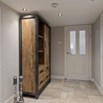 Meteen bij binnenkomst kom je in de hal die toegang biedt tot het kantoor. Hier bevindt zich de meterkast, de garderobe-nis en de trapopgang naar de verdieping. Een leuk detail is de kastdeur met spiegel waarachter zich de meterkast bevindt.