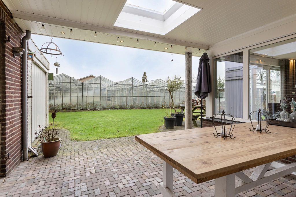 Via de openslaande terrasdeuren in de keuken bereik je de veranda met beklinkerd terras. Dankzij de twee lichtkoepels is deze veranda aangenaam licht. Naast de veranda bevindt zich nog een aanpandige berging met garagedeur. Deze berging was in het verleden in gebruik als garage en beschikt over een smeerput.