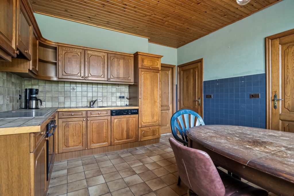 De woonkeuken is ruim opgezet en voorzien van een klassieke, houten keukenopstelling in L-vorm met de benodigde inbouwapparatuur zoals een vaatwasser, oven, keramische kookplaat met afzuigkap, koelkast en spoelbak. Dankzij het grote raam is er veel natuurlijk licht en heb je een vrij uitzicht op de naastgelegen landerijen. Bovendien biedt de ruimte voldoende plek voor een gezellige eettafel. Vanuit de keuken is er toegang tot de woonkamer, een praktische kelder en is er doorgang naar de achterentree.