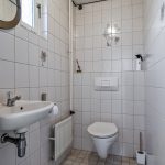 De achterentree is afgewerkt met dezelfde tegelvloer als in de keuken en entree van de woning. De muur is tevens half betegeld en het plafond bestaat uit houten schrootjes. Vanuit hier is er toegang tot een geheel betegeld toilet met zwevend closet en fonteinje. Verder is de meterkast gesitueerd in een muurkast en is er vanuit deze achterentree toegang tot de badkamer en een ruime berging (bedrijfsgedeelte).