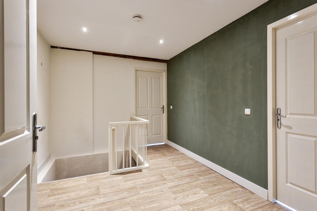 De trapopgang naar de verdieping bevindt zich in de woonkamer, afgesloten met een deur. De overloop op de verdieping biedt toegang tot drie slaapkamers, de c.v.-ruimte, bergruimte en het toilet. De afwerking van de wanden en plafonds zijn in smaakvolle kleurstelling en met vrijwel op de gehele verdieping een linoleum vloer, gestucte wanden en gestucte plafonds met spotjes.