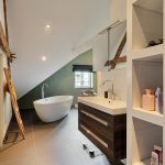 De grote slaapkamer is fraai ingericht met in het oog springende rustieke balken en met een luxe ensuite badkamer. De badkamer is voorzien van een vrijstaand bad, wastafelmeubel met spiegelkast, inloopdouche, wandkast en designradiator. Vanuit hier heb je toegang tot de ruime bergzolder, waar o.a. de omvormer van de zonnepanelen is geïnstalleerd. Deze bergzolder biedt uitbreidingsmogelijkheden, bijvoorbeeld voor extra (slaap)kamers.