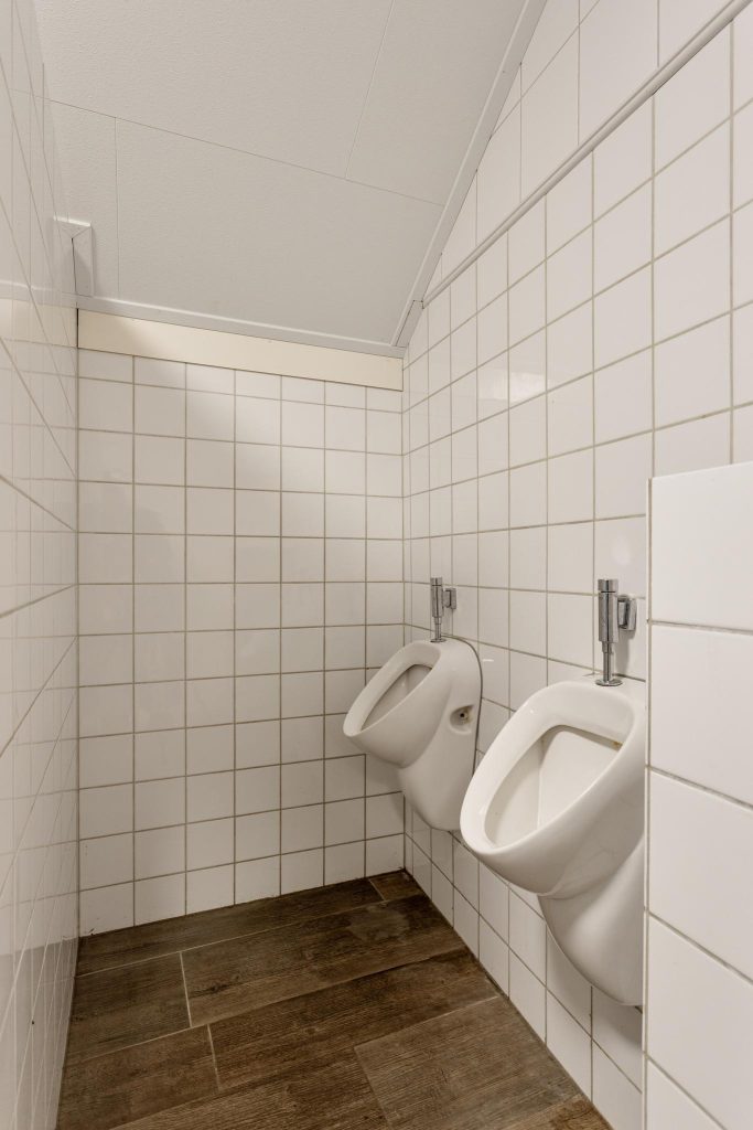 De geheel betegelde badkamer is bereikbaar via het achterportaal en voorzien van inloopdouche, wastafelmeubel, wandkast, toilet en designradiator. Via het achterportaal bereik je het horecagedeelte.