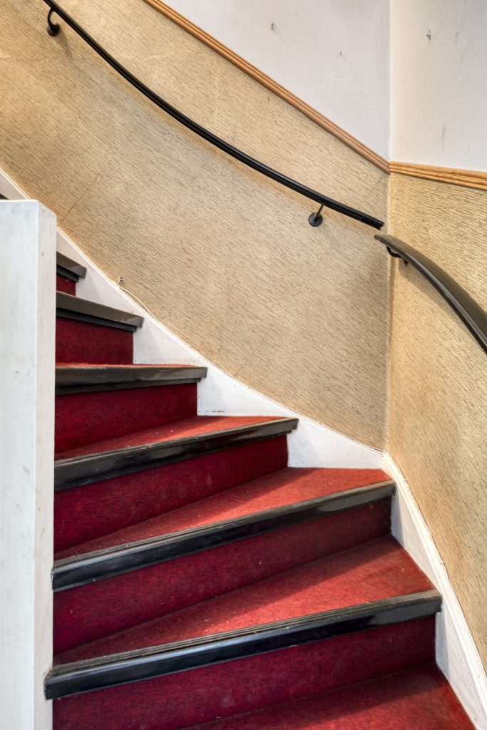 Vanuit de keuken is een hal met trapopgang naar de verdieping toegankelijk en een tweede woon-/ zitkamer. Deze lichte kamer is afgewerkt met kunststoflambrisering met behangwanden en heeft een tapijt vloerbedekking. De klassieke schouw met gaskachel voegt warmte toe aan deze ruimte. De ramen bestaan uit houten kozijnen met enkelglas. Onder de trap is een praktische muurkast aanwezig.