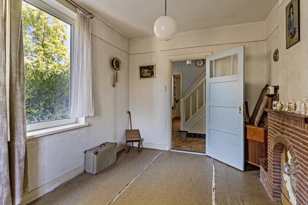 De woonkamer beschikt over 2 grote raampartijen welke een mooi uitzicht geven op de voortuin en een natuurlijk en vrij uitzicht bieden over de voorgelegen landerijen. De vloer is voorzien van laminaat met eronder een tegeltjes vloer. De wanden zijn voorzien van lambrisering. Ook hier is nog een authentieke schouw aanwezig waar voorheen de gaskachel dienst deed als verwarming. In de woonkamer is de meterkast gesitueerd.