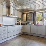 Via een glazen deur met drempelloos doorgelegde tegelvloer bereik je de moderne keuken. Het ruime, U-vormige keukenblok met een duurzaam granieten aanrechtblad biedt een zee aan bergruimte. De keuken is uitgerust met een 5-pits inductiekookplaat, afzuigkap, 1,5 spoelbak, koelkast, elektrische oven en een vaatwasser.