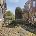 Aan de rechterzijde van de woning is de tuin grotendeels aangelegd met een ruim gazon, omringd door weelderige borders met diverse beplanting en hagen. Deze zorgen niet alleen voor privacy, maar geven het geheel ook een natuurlijke en levendige uitstraling. Opvallend detail: aan deze zijde zijn de ramen voorzien van karakteristieke luiken, die bijdragen aan de charmante uitstraling van de woning.