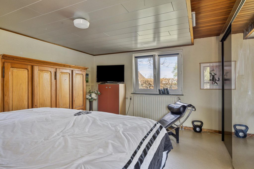Via de gang bereik je de garderobekamer, het toilet, twee badkamers en de masterbedroom. Tevens vind je in de gang twee praktische muurkasten. De masterbedroom is bijzonder ruim en is ingericht met een vinylvloer en een schroten plafond. Vanuit deze kamer heb je direct toegang tot de tuin via een