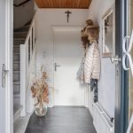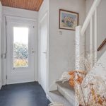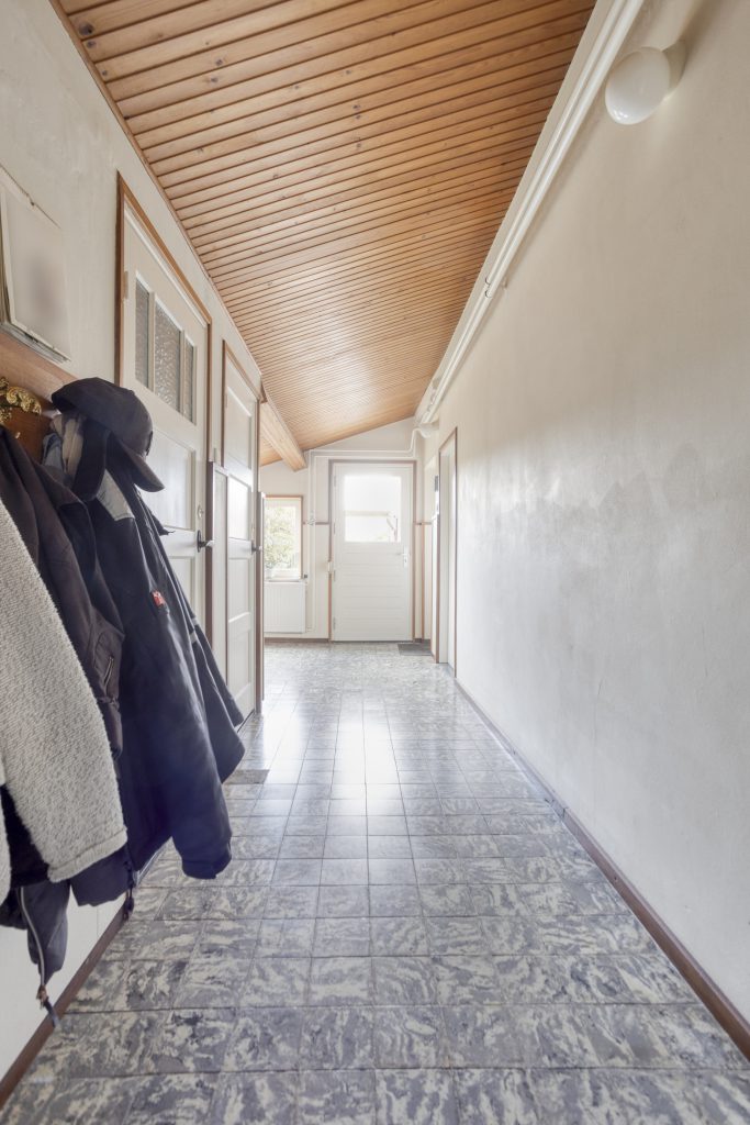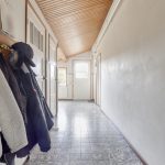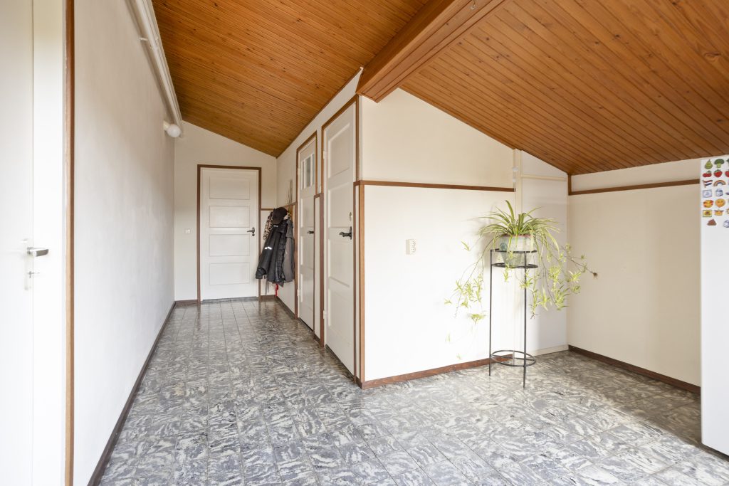 Het achterportaal met tegelvloer en schrootjes plafond, geeft toegang tot det tuin en voormalige garage die aan de voorrzijde van de woning ligt.
