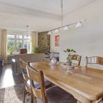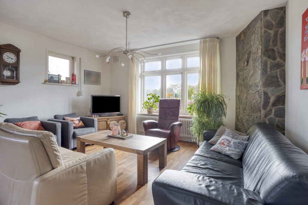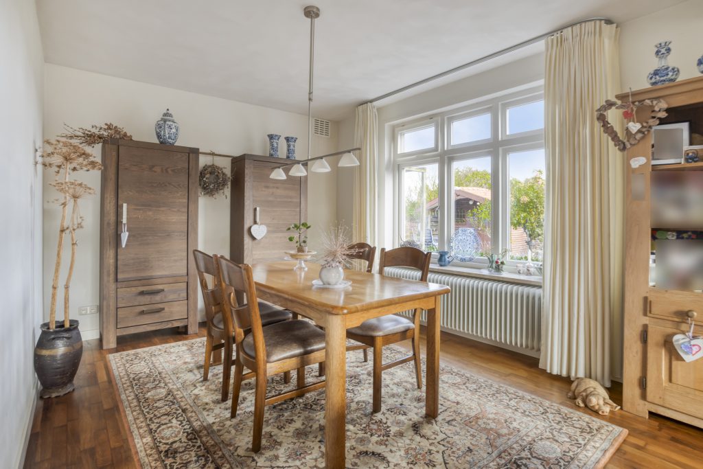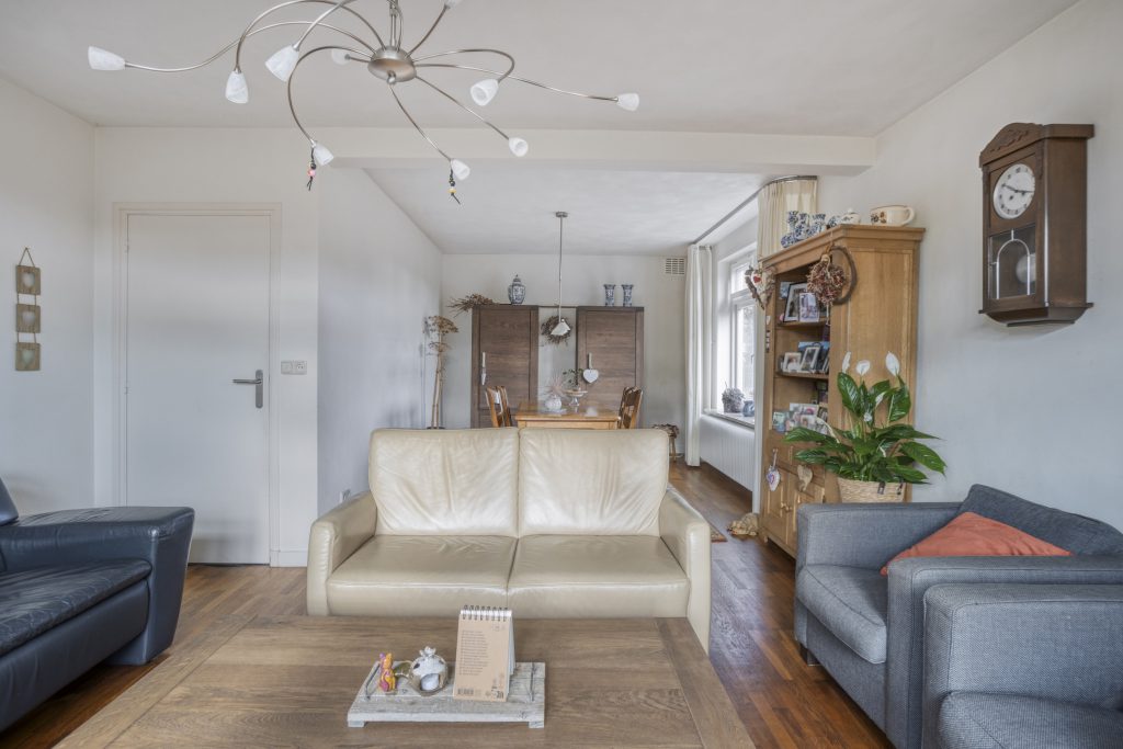 De woonkamer is voorzien van radiatoren, een parketvloer die nog in nette staat verkeert, houten kozijnen met dubbel glas (2000) en een rookkanaal. De ruimte is licht en biedt uitzicht op de tuin die rondom de woning ligt.