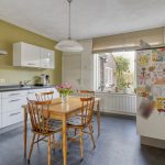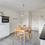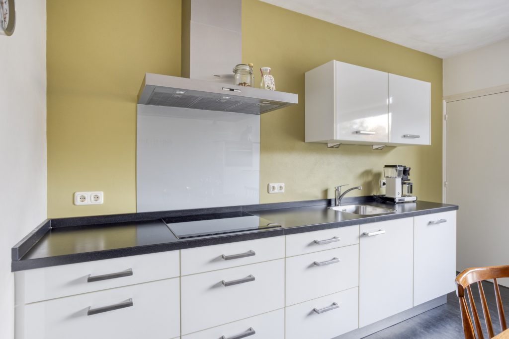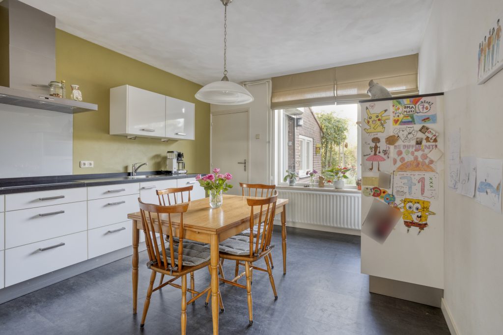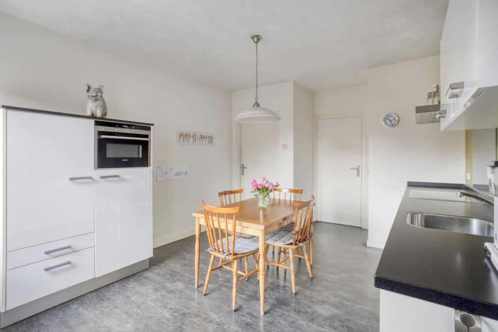 De keuken is in 2012 gerenoveerd. Het hoogglans witte keukenblok is voorzien van een matzwart werkblad en uitgerust met een inductie kookplaat , vaatwasser, afzuigkap, koelkast, combimagnetron en voldoende bergruimte. Op de vloer ligt een donkergrijze pvc-vloer. Er is ruimte om een eettafel te plaatsen. Vanuit de keuken heeft u toegang tot zowel de kelder, woonkamer als het achterportaal.
