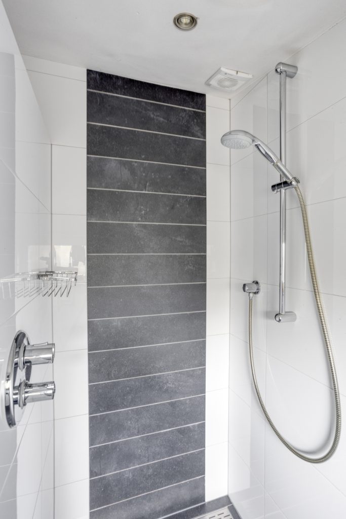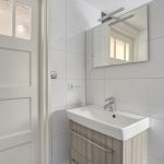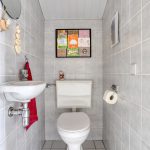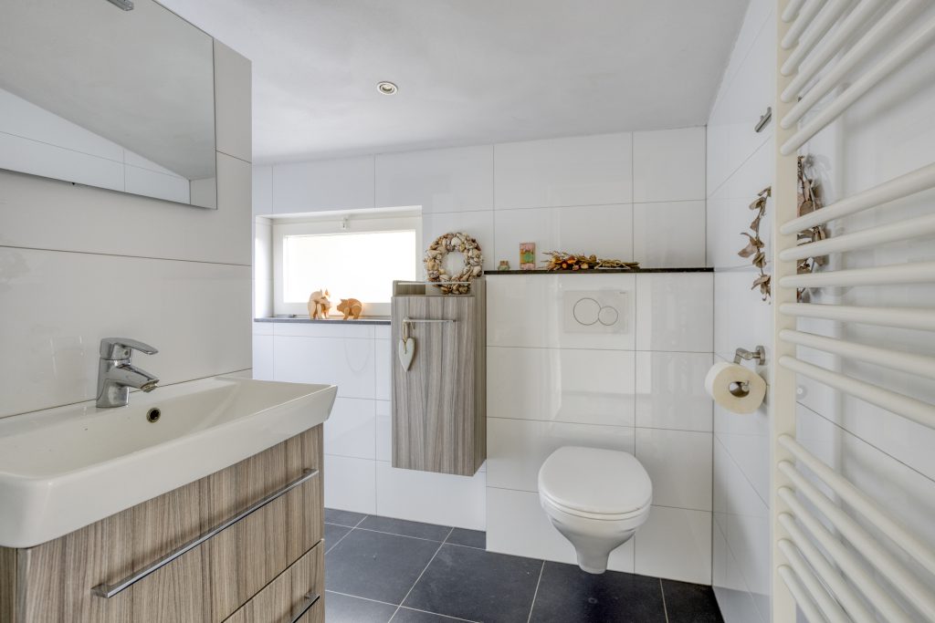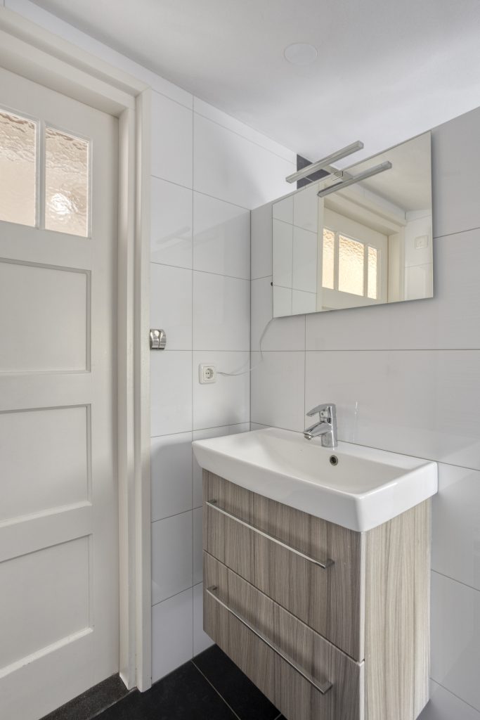 een apart toilet, de badkamer (vernieuwd in 2012) met wastafelmeubel, inloopdouche, toilet en vloerverwarming en een berging waar de cv-ketel (Nefit Excellent Ecomline HR, 2012) en de boiler (Nefit) zijn geplaatst.